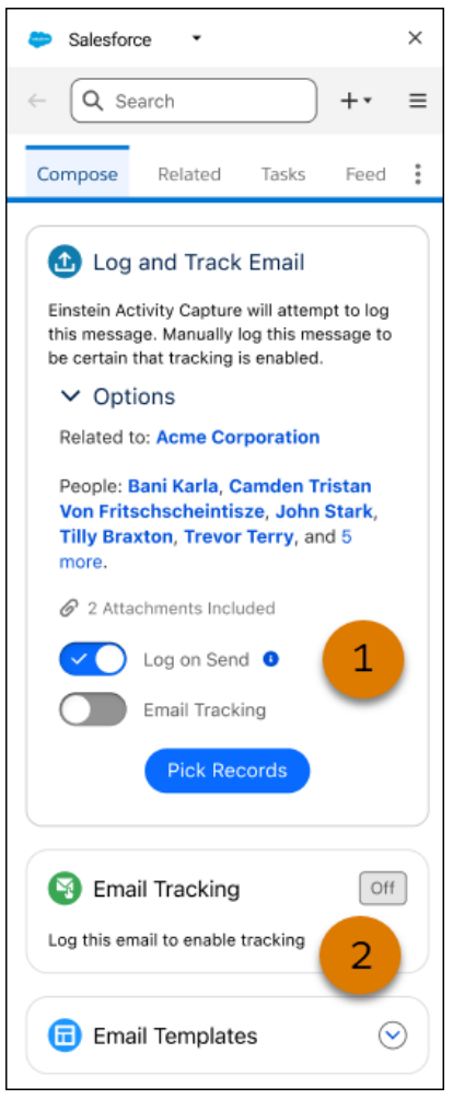 What: If your org uses Inbox or has Sync Email as Salesforce Activity enabled in Einstein Activity Capture, users are now required to log emails in order to track them. To make this easier, Salesforce has updated the email side panel with a new Log and Track Email section that combines both actions. Previously, email tracking was in a separate component and didn’t require logging.