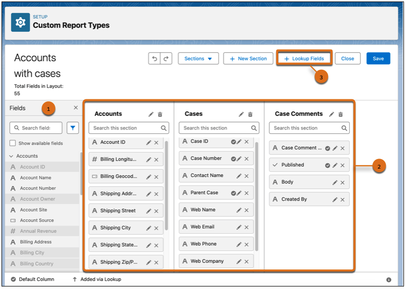 Additionally, when editing a custom report type layout, fields can now be dragged and dropped into sections from the fields panel (1) on the left, making it more intuitive to customize the field layouts in your report types. Other improvements include the option to search for fields in the report section (2), and to reorder or customize the display names of fields. And finally, easier access to Lookup Fields (3) make building and editing custom reports simpler than ever.